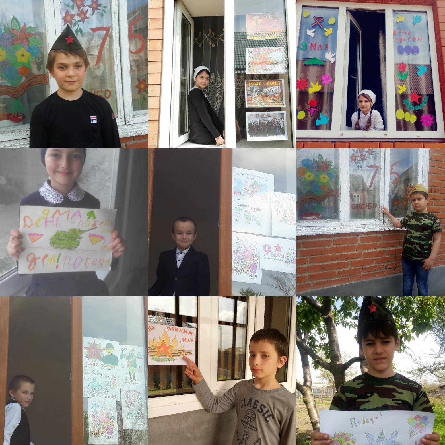 Учащийся нашей школы оформили окна домов рисунками,картинками, фотографиями и надписями посвященными Победе советского народа над Фашизмом в великой отечественной Войне .
