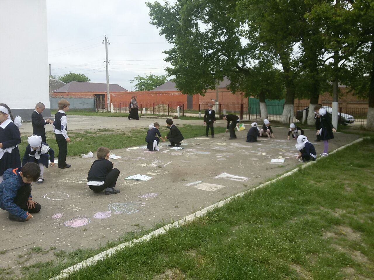Первоклассники школы цветными мелками рисовали на асфальте разные рисунки.