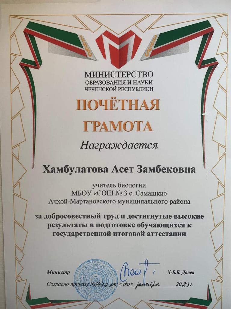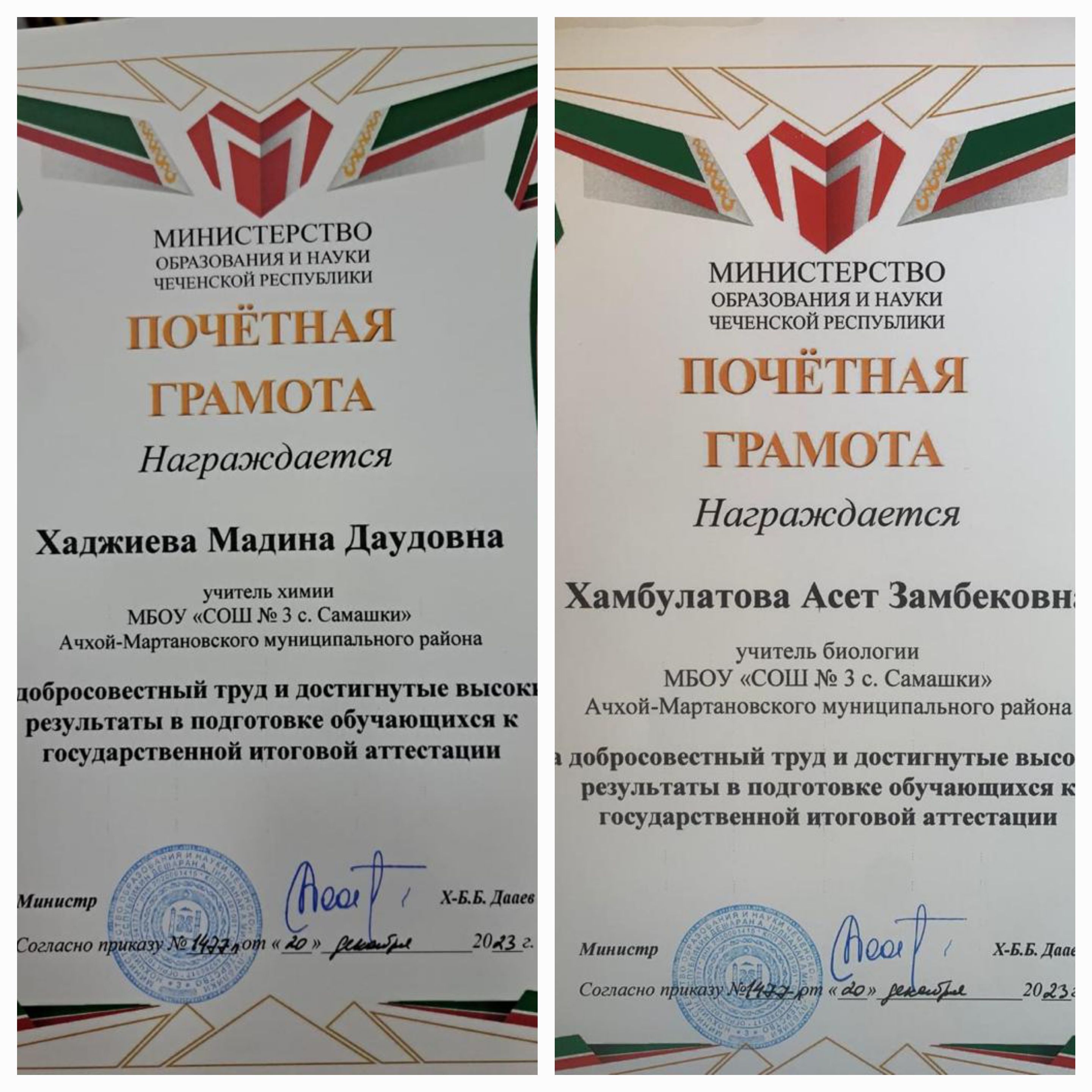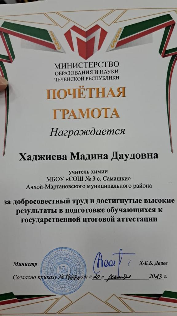 29.12.2023В рамках реализации федерального национального проекта «Образование», в преддверии новогодних праздников на базе лингвистической школы г.Грозного нашим учителям, Хаджиевой М.Д. и Хамбулатовой А.З., были вручены Почетные грамоты за эффективную подготовку к ЕГЭ по химии и биологии министром образования и науки Дааевым Хож-Бауди Буаровичем.