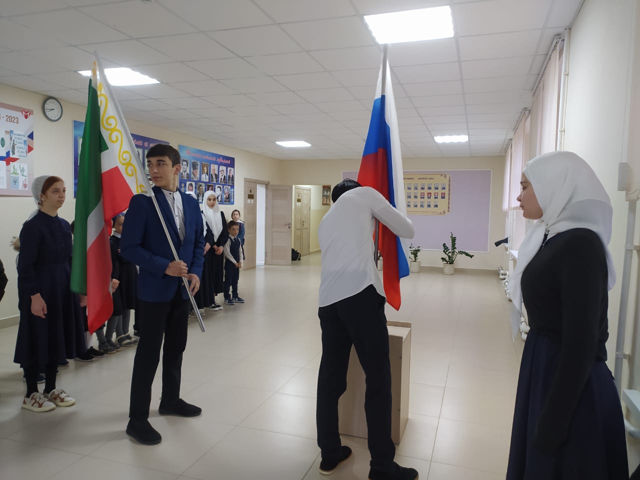 19.02.2024Новая учебная неделя в МБОУ «СОШ №3 с. Самашки» началась традиционно: Линейка, посвященная установлению Государственного Флага Российской Федерации, флага Чеченской Республики и исполнение гимнов. Награждение обучающихся грамотами по итогам прошедшей недели. После линейки обучающиеся прошли в свои кабинеты на очередное занятие "Разговоры о важном".