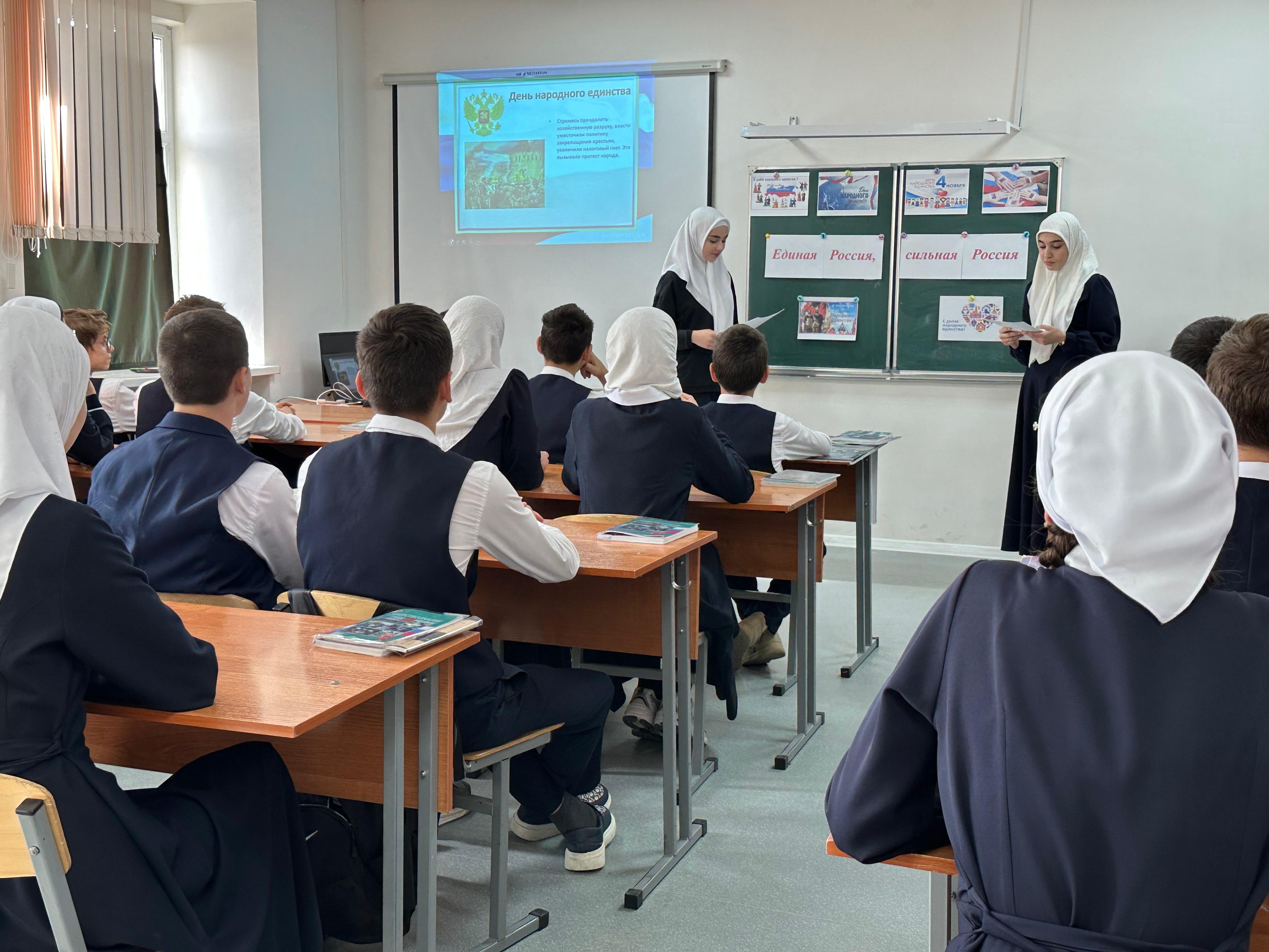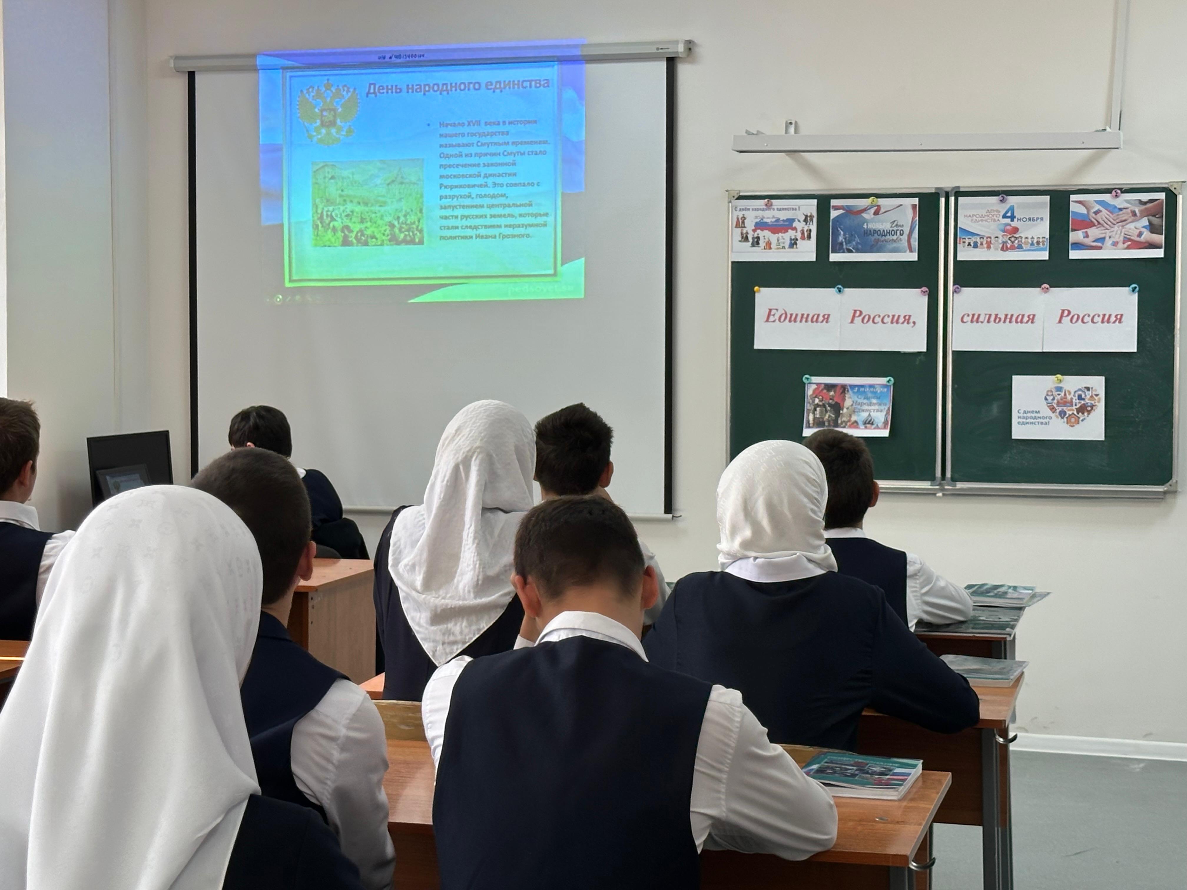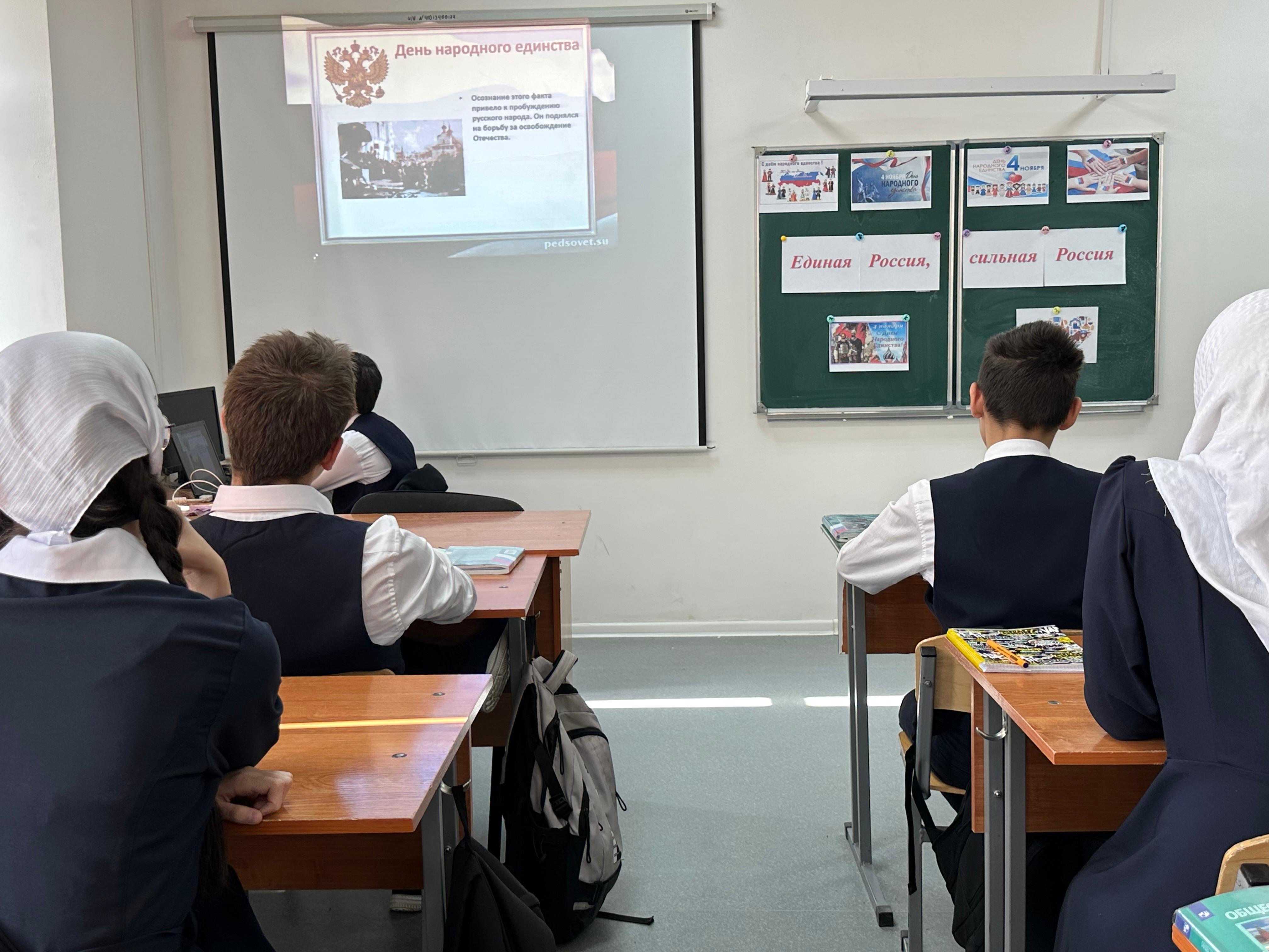 05.11.2024В преддверии праздника "День народного единства" педагог- организатор с учащимися 8 а класса провела мероприятие с целью расширения представления детей о родном крае, стране, в котором мы живем, развитии любознательности, привития любви к Родине, воспитания патриотических чувств, доброжелательного отношения друг к другу, желание прийти на помощь. В ходе мероприятия учащиеся пели песни, читали стихи. В конце мероприятия учащиеся дружно хором прочитали строчки из стихотворения ,тем самым демонстрируя единство, сплоченность и силу, подтверждая и подчёркивая мысль-" И только единстве сила России".