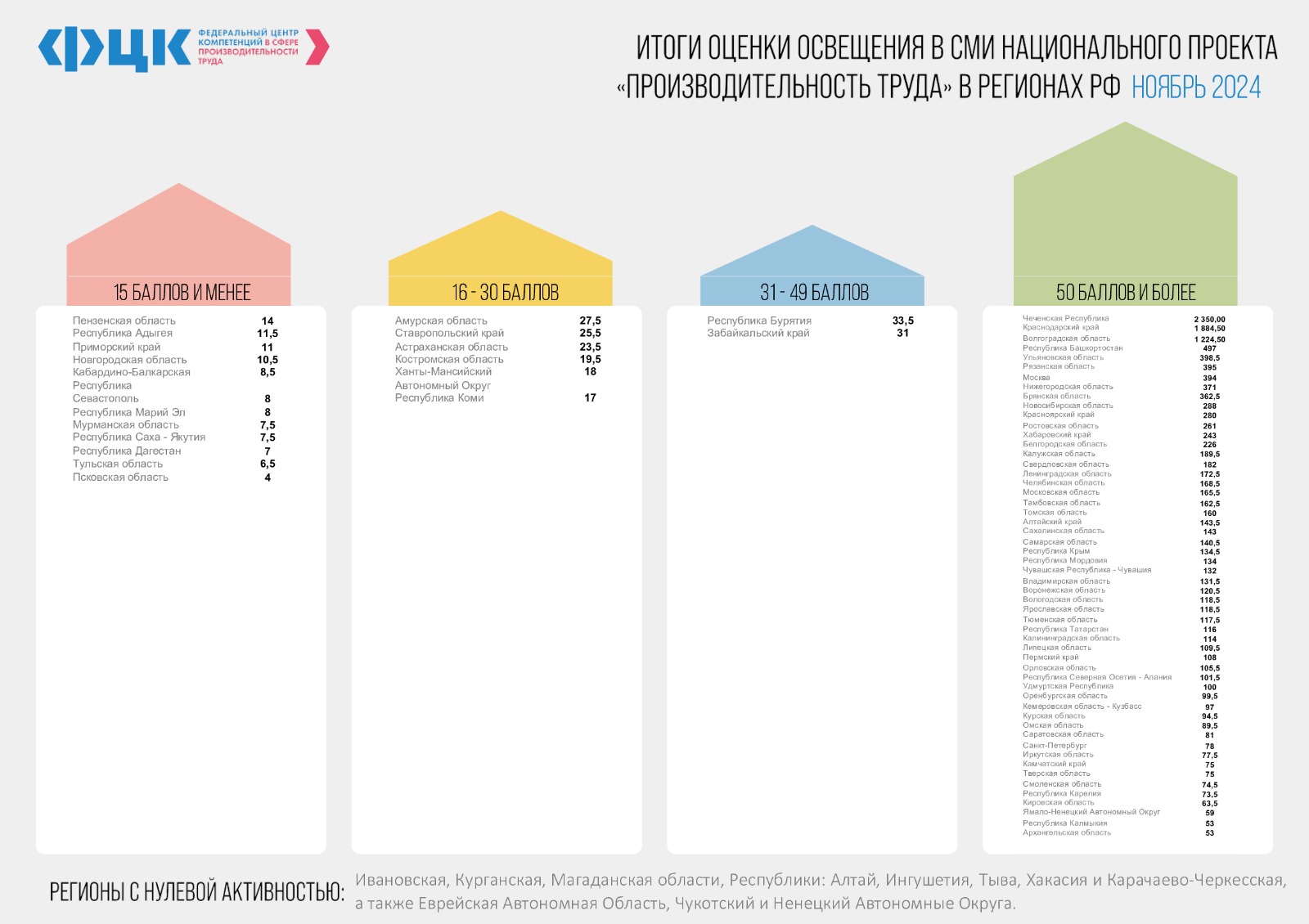 16.12.2024По итогам подведенным ФЦК за ноябрь 2024 года, Чеченская Республика вошла в лидирующую группу и заняла первое место.